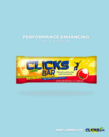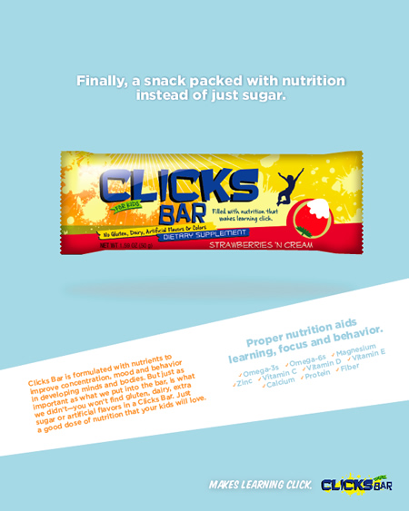 Clicks Bar is a nutritional suplement bar for children similar to the Cliff-Z bar. I developed a series of magazine ads for the product launch. Copywriting and design.